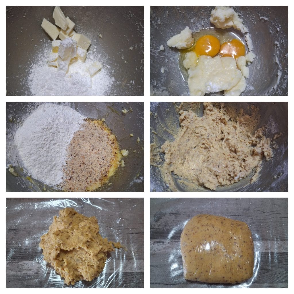 Para fazer esses deliciosos biscoitos de avelã crocantes, primeiro você precisa fazer a massa de avelã. Em uma tigela, adicione a manteiga amolecida e o açúcar de confeiteiro e bata com a batedeira elétrica até obter uma mistura macia, adicione o ovo mais a gema e continue misturando. Finalmente, adicione as duas farinhas, a essência de amêndoa, o sal e misture cuidadosamente até obter uma massa homogênea e pegajosa. Cuidadosamente, pegue a massa e envolva-a no filme plástico e coloque na geladeira para descansar.