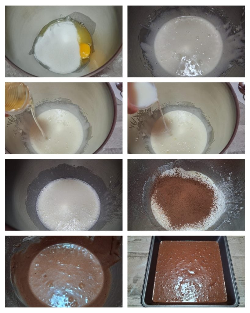 • Para fazer este delicioso bolo brasileiro, primeiro faça o bolo de chocolate. Em uma tigela, misture com uma batedeira elétrica por alguns minutos o açúcar refinado, a baunilha e os ovos. Adicione o óleo e continue misturando, depois acrescente o leite e misture bem. Por fim, adicione a farinha de trigo peneirada e o cacau em pó e, por último, adicione o fermento em pó e o sal fino, misturando bem até obter uma massa lisa e homogênea. Unte e enfarinhe uma forma de 25×25 e despeje a massa. Asse em forno estático pré-aquecido a 180º por 35 minutos, faça o teste do palito.