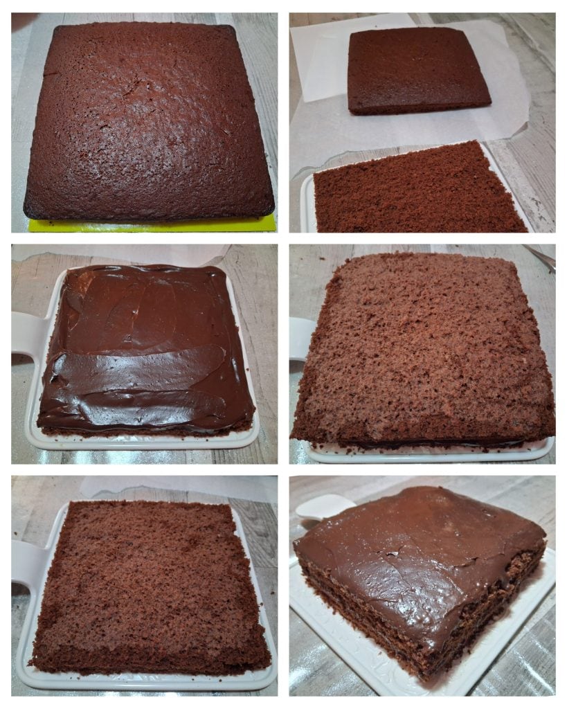 • Corte o bolo ao meio e umedeça com leite ou xarope de água e açúcar, despeje metade do creme de chocolate e nivele bem, feche com a outra camada de bolo, sempre levemente umedecido com leite ou água e açúcar, e despeje o restante do creme, nivelando uniformemente. Coloque o bolo na geladeira para firmar por 5-6 horas ou durante a noite.