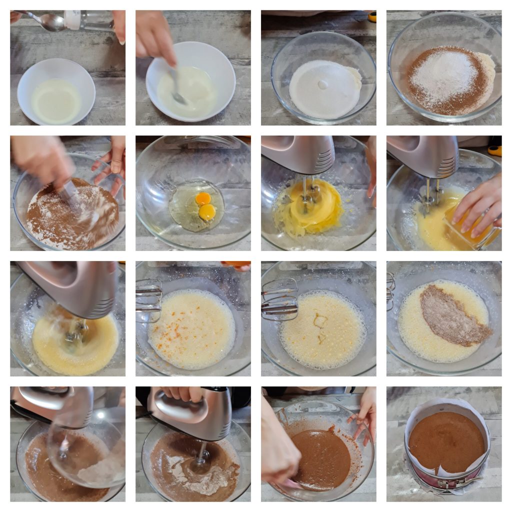 Para preparar este delicioso bolo de chocolate, comece fazendo o bolo. Primeiro, coloque o leite em um copo e adicione o vinagre, deixando repousar por 15 minutos (isso será nosso buttermilk). Em uma tigela, misture todos os ingredientes secos usando um batedor manual: o açúcar refinado, a farinha de trigo 00, o cacau sem açúcar peneirado, o fermento em pó e o sal. Em outra tigela grande, bata com uma batedeira elétrica o ovo e a gema junto com o óleo de girassol e adicione o buttermilk, as raspas de laranja e misture bem. Por fim, adicione os ingredientes secos em duas etapas, misturando até obter uma massa homogênea. Unte e enfarinhe uma forma de fundo removível de 20 cm de diâmetro e 10 cm de altura e despeje a massa. Para aumentar a altura da forma, usei papel manteiga. Asse em forno pré-aquecido a 165ºC por 55 minutos, fazendo o teste do palito. Desligue, retire do forno e deixe esfriar.