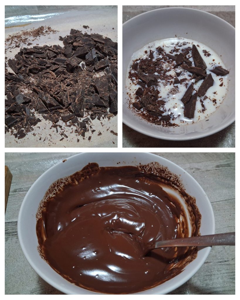 Enquanto o bolo descansa, prepare a cobertura de chocolate. Aqueça o creme de leite em uma panela pequena e adicione o chocolate amargo em pedaços e mexa vigorosamente, por último adicione o óleo e deixe esfriar até a temperatura de 35º.