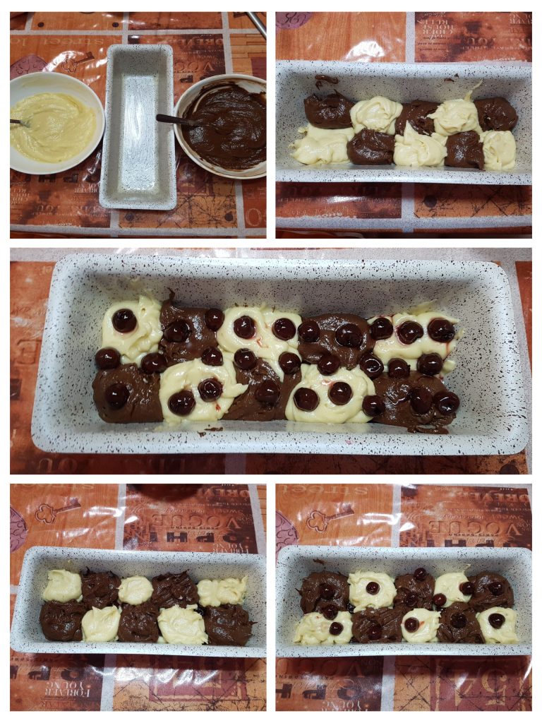 Unte e enfarinhe uma forma para bolo inglês de 22-24 cm e despeje primeiro uma colher da massa branca e depois a de cacau, uma ao lado da outra, como mostrado nas fotos. Após fazer a primeira camada, disponha as cerejas em calda e, em seguida, continue alternando as massas até acabar. Decore a superfície com mais cerejas em calda e asse em forno estático pré-aquecido a 180ºC por 40 minutos. Faça o teste do palito, desligue, retire do forno e deixe esfriar.