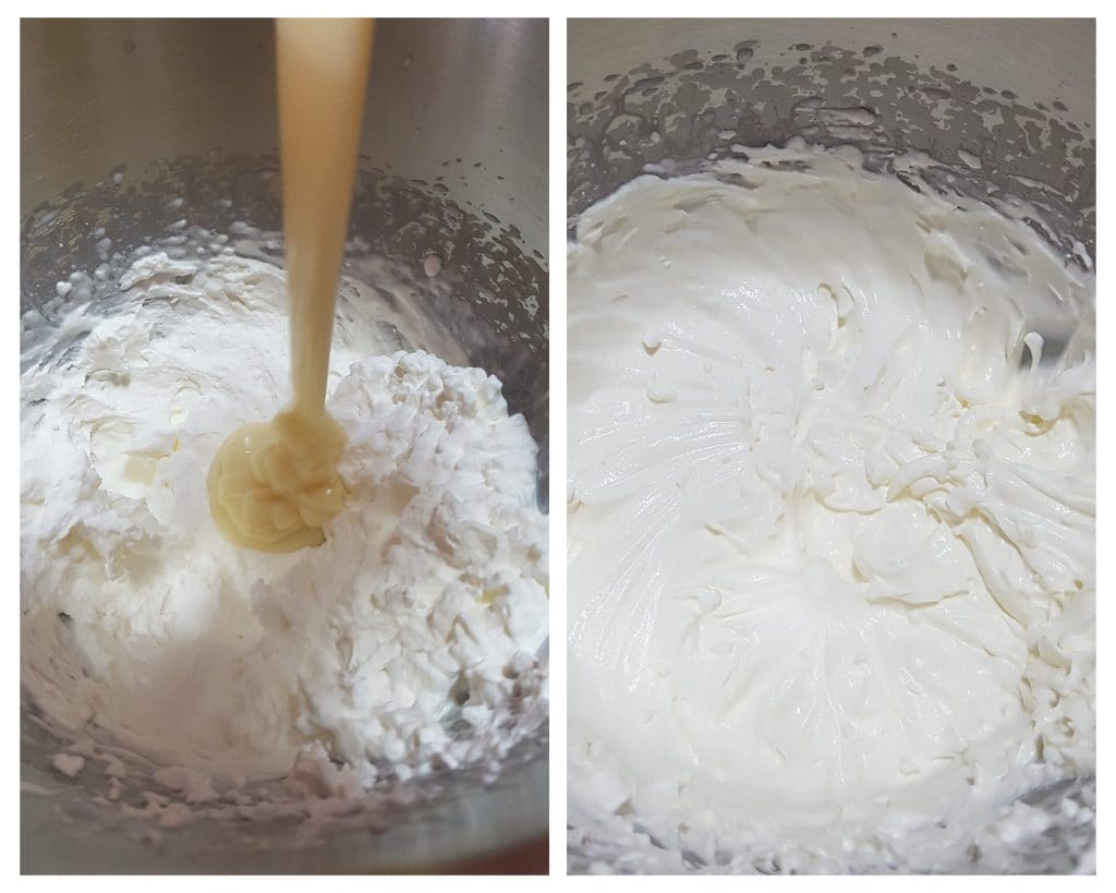 Em uma tigela, bata com batedor elétrico o creme de leite fresco bem frio da geladeira, quando estiver bem firme, adicione aos poucos o leite condensado frio da geladeira, o mel e continue batendo até obter uma mistura espumosa.