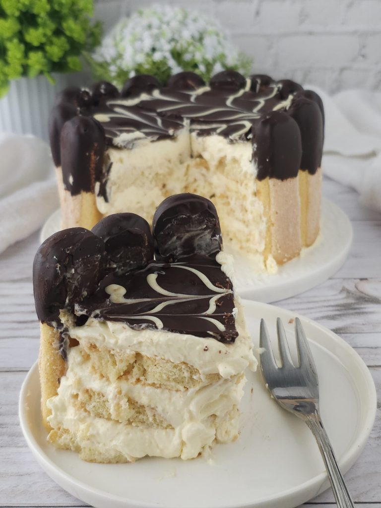 Primeiro corte cerca de 1 cm das pontas dos savoiardi e cubra as pontas restantes (a outra extremidade) com chocolate previamente derretido. Deixe secar sobre uma assadeira forrada com papel manteiga e leve à geladeira por 30 minutos. Quando estiverem frios, pegue o prato de apresentação e coloque um aro de aço ou simplesmente um aro removível de uma forma redonda de 20 cm e disponha os savoiardi em círculo, encaixando-os bem para não caírem. Eu costumo “fixar” cada base do savoiardo no prato com um pouco do creme diplomático. No fundo da forma, coloque alguns savoiardi umedecidos levemente com um pouco de leite ou com uma calda alcoólica. Despeje uma camada de creme diplomático sobre a base, faça uma segunda camada de savoiardi umedecidos no leite, despeje mais creme diplomático, outra camada de savoiardi e, por fim, mais creme diplomático. Leve a forma à geladeira para descansar por cerca de 6–8 horas.