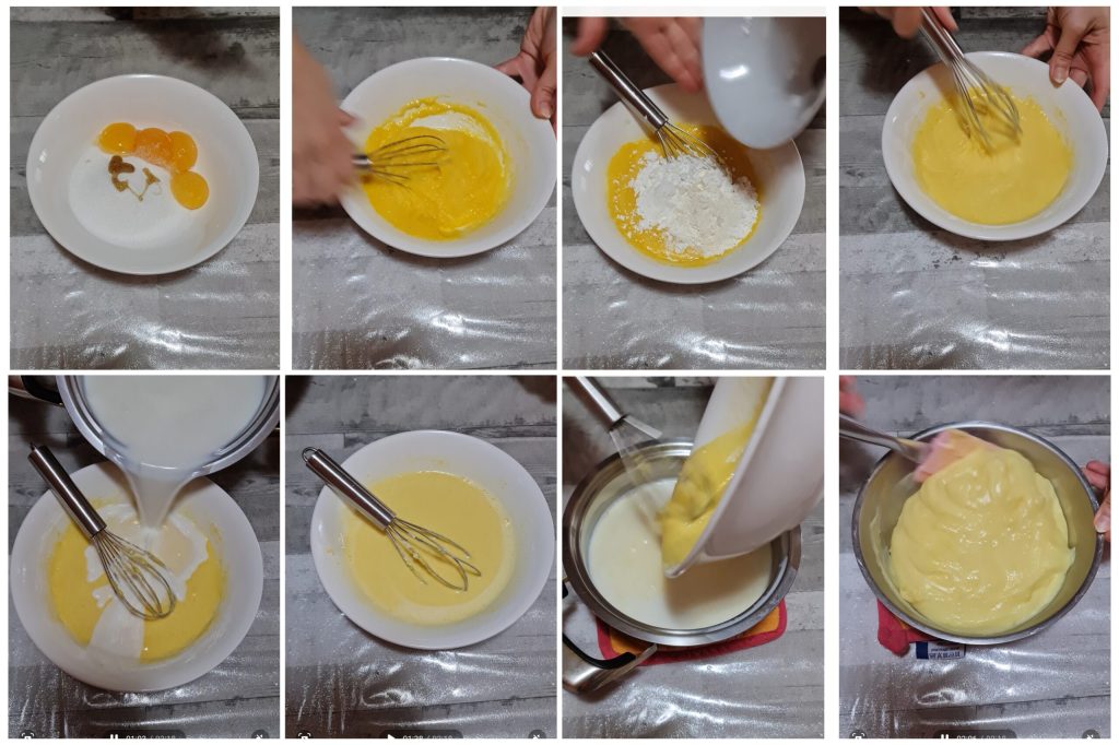 Para fazer o creme diplomático, comece preparando o creme pâtissier. Coloque o leite em uma panela e aqueça no fogo. À parte, em uma tigela, bata as gemas com o açúcar e a essência de baunilha com um batedor. Em seguida junte o amido de milho e o sal, misturando bem. Despeje a mistura de ovos no leite quente e leve à fervura, mexendo sempre com o batedor para evitar grumos, até engrossar completamente. Retire do fogo, coloque filme plástico em contato com a superfície do creme e deixe esfriar em temperatura ambiente por algumas horas.