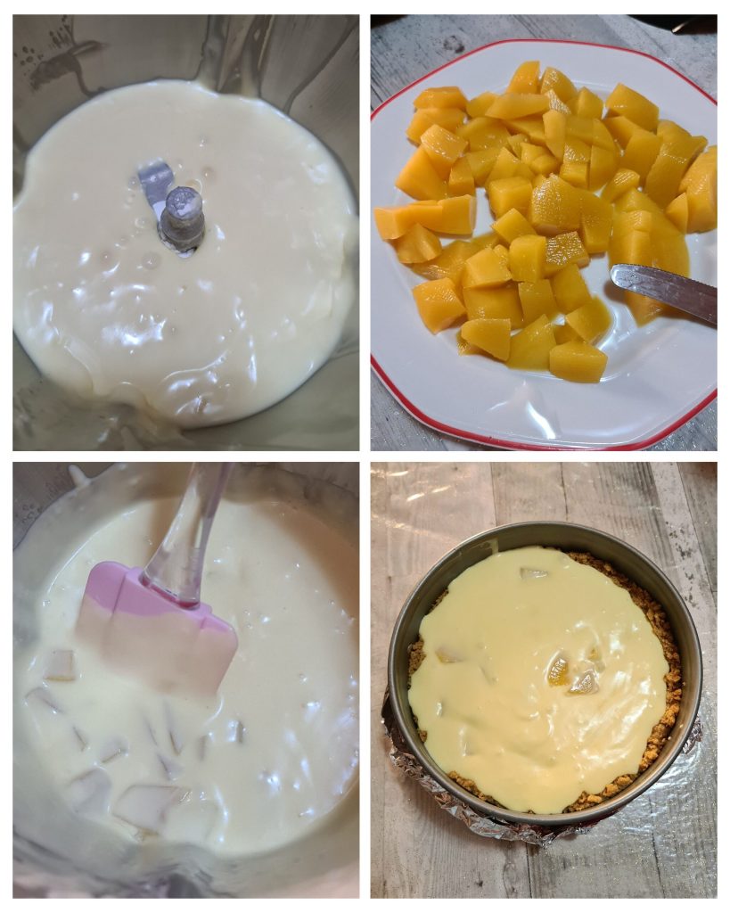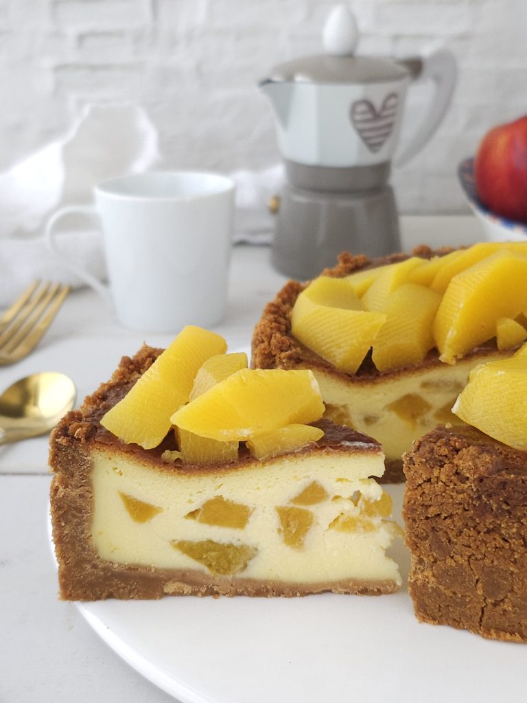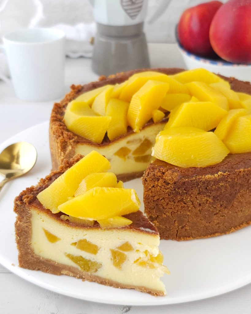 • Em uma tigela grande, adicione o mascarpone deixado em temperatura ambiente por 30 minutos. Em seguida, adicione o açúcar refinado e bata com batedores elétricos por alguns minutos. Adicione o creme de leite, também deixado fora da geladeira por 15 minutos antes de usar, a essência de baunilha e continue misturando. Agora adicione os ovos, um de cada vez, e finalmente o amido de milho com o sal e continue misturando até obter uma mistura lisa e homogênea. Corte os pêssegos em calda em cubos (não todos, alguns serão usados para a decoração final) e adicione à mistura. Misture bem. Retire a forma do freezer e despeje a mistura sobre a base de biscoito. Pré-aqueça o forno estático a 160º por pelo menos 15 minutos antes. Em seguida, asse a cheesecake por 50-60 minutos a 160º. Desligue o forno, abra um pouco a porta do forno e deixe a cheesecake dentro do forno por mais 45 minutos. Após esse tempo, deixe esfriar completamente à temperatura ambiente.