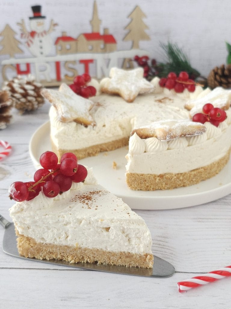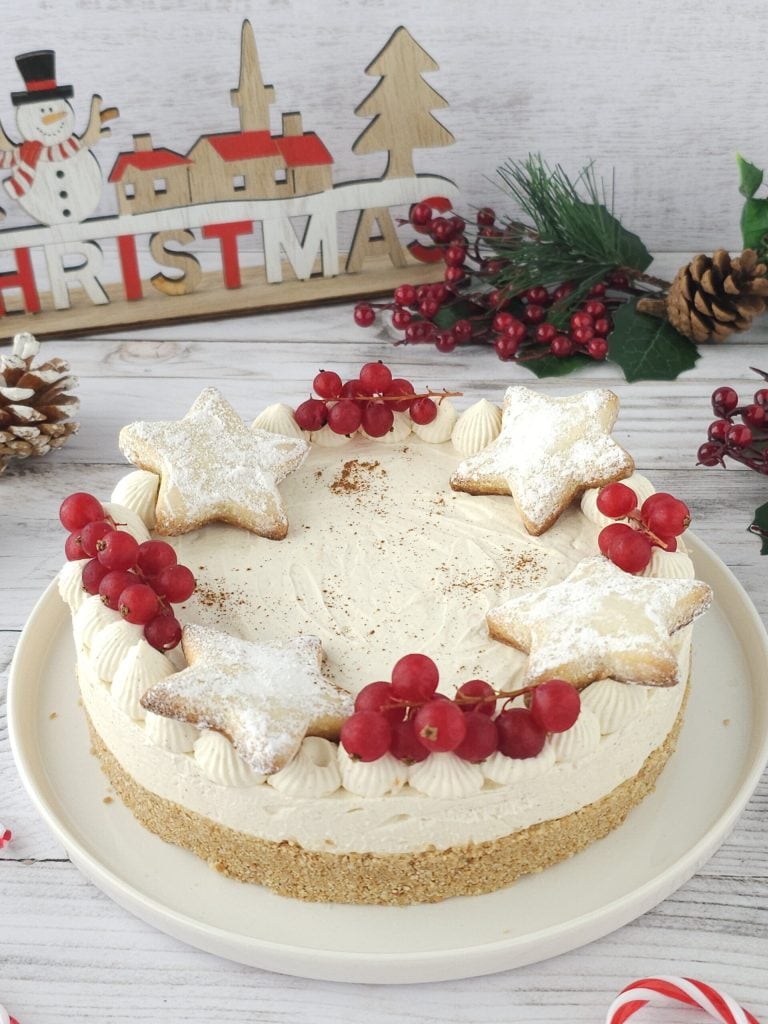 Retire o bolo do freezer e desenforme com cuidado o aro ou anel com a ajuda de um secador de cabelo, retire também o papel manteiga e coloque o bolo em um prato de servir. Transfira a cheesecake para a geladeira para climatizar por 1 hora e decore então a superfície com ramos de groselhas, toques de creme de leite batido e biscoitos em forma de estrela. E aí está ela pronta para servir, a cheesecake de torrone. Espero que gostem desta minha última receita, até a próxima amigos.
