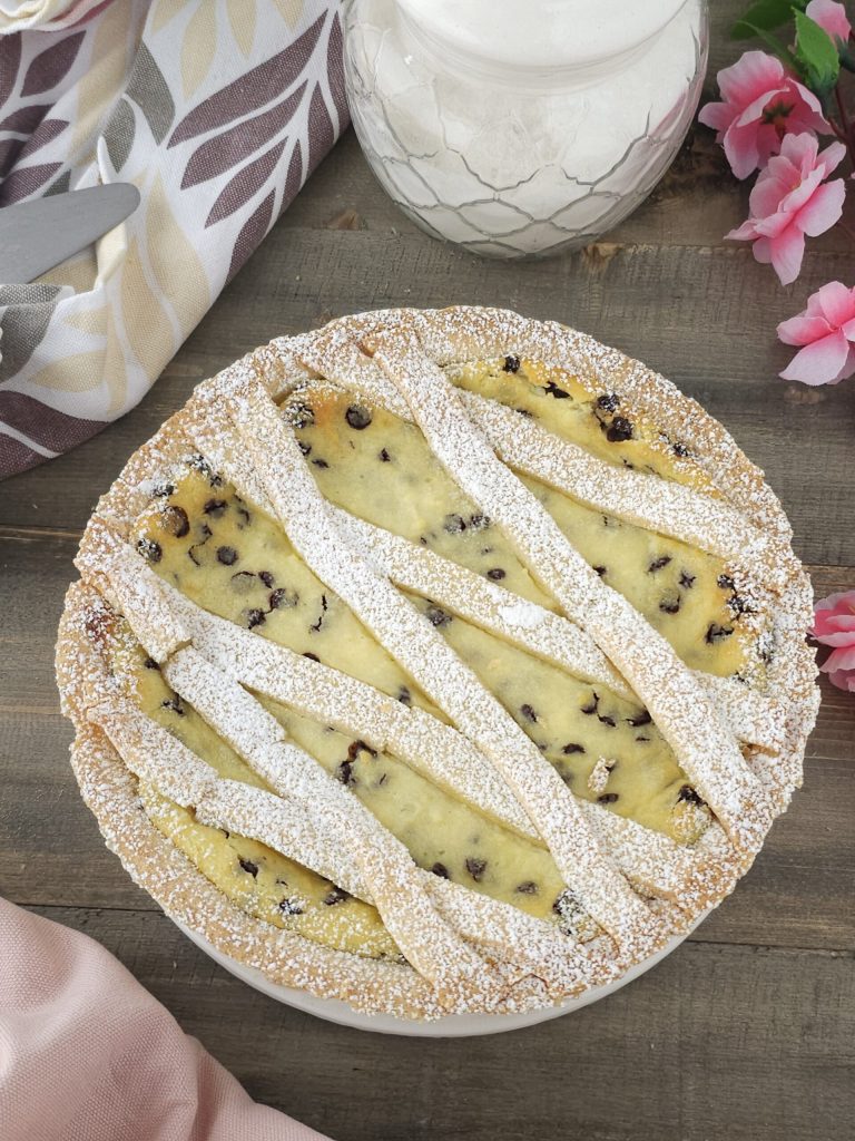 Em uma tigela, misture a ricota com o açúcar, a raspa de limão e, por fim, o ovo, obtendo um creme liso e homogêneo; acrescente então as gotas de chocolate e incorpore com cuidado. Leve à geladeira por 30 minutos para firmar. Retire a massa frolla da geladeira e abra sobre uma superfície enfarinhada com uma espessura de cerca de 3–4 mm. Forre uma forma de crostata de 22 cm previamente untada e enfarinhada, formando assim um fundo com bordas altas. Fure a base com um garfo e despeje o creme de ricota, nivelando bem. Com a massa restante, forme o reticulado (ou seja, as tiras). Asse em forno pré-aquecido por cerca de 40–45 minutos a 180°C. Verifique o ponto, desligue, retire do forno e deixe esfriar.