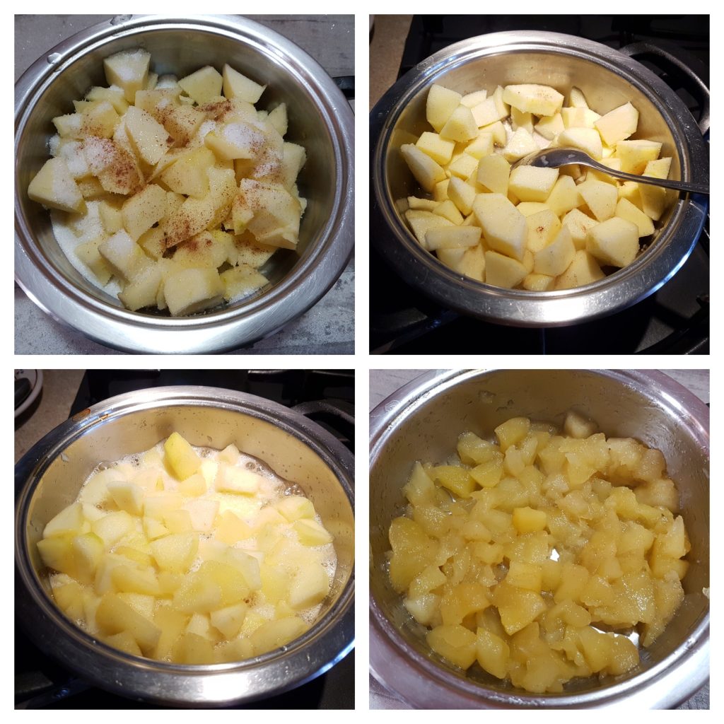 Descasque as maçãs e corte-as em cubos. Coloque em uma panela pequena e adicione o açúcar, o suco de limão e a canela e misture bem. Cozinhe as maçãs até ficarem macias, acrescentando água de vez em quando. Quando as maçãs estiverem macias, desligue o fogo.
