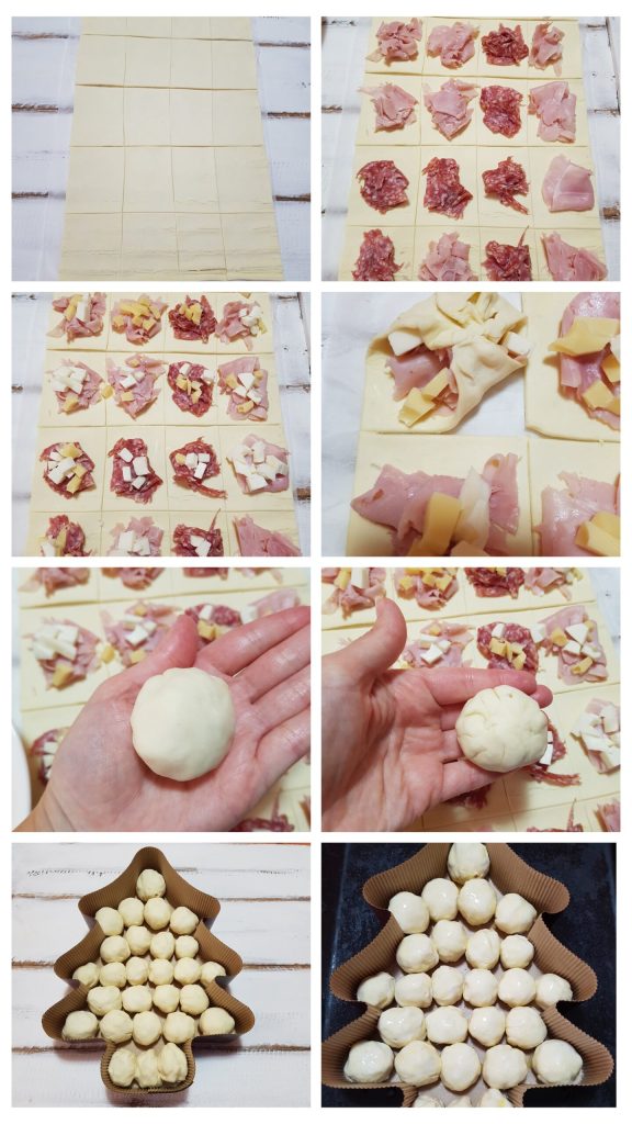 • Para realizar este fantástico danúbio árvore de natal de massa folhada é necessário desenrolar as duas folhas retangulares e dividir em quadrados mais ou menos grandes de 7×8. Colocar sobre cada quadrado os embutidos, eu fiz uma mistura entre presunto cozido e salame com os diversos queijos previamente cortados em cubos. Fechar formando bolinhas e posicioná-las todas na forma de papel em forma de árvore de natal. Pincelar a superfície com um ovo batido e assar em forno pré-aquecido estático a 180º/190º por 35-40 minutos ou até dourar. Desligar, retirar do forno e deixar esfriar por cerca de dez minutos.