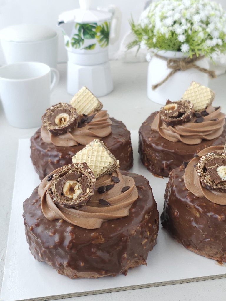 Olá amigos, hoje trago para vocês esses deliciosos docinhos individuais rocher que vão conquistar vocês na primeira mordida. São mini bolinhos de chocolate recheados com creme de mascarpone e Nutella e cobertos com uma cobertura rocher. Garanto que são muito fáceis de fazer. A seguir, você encontrará a receita..