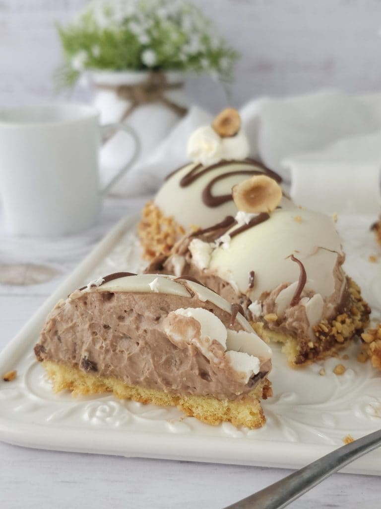 Quando a base já estiver fria, corte discos com um cortador de massa de 6-8 cm e reserve. Enquanto isso, derreta o chocolate branco em banho-maria e despeje algumas colheres do chocolate derretido na forma de silicone das meias esferas e pincele algumas vezes como na foto para cobrir completamente a forma. Coloque no freezer por 30 minutos para endurecer. Retire a forma do freezer, despeje o creme rocher nas várias meias esferas e coloque um disco de base macia selando tudo.