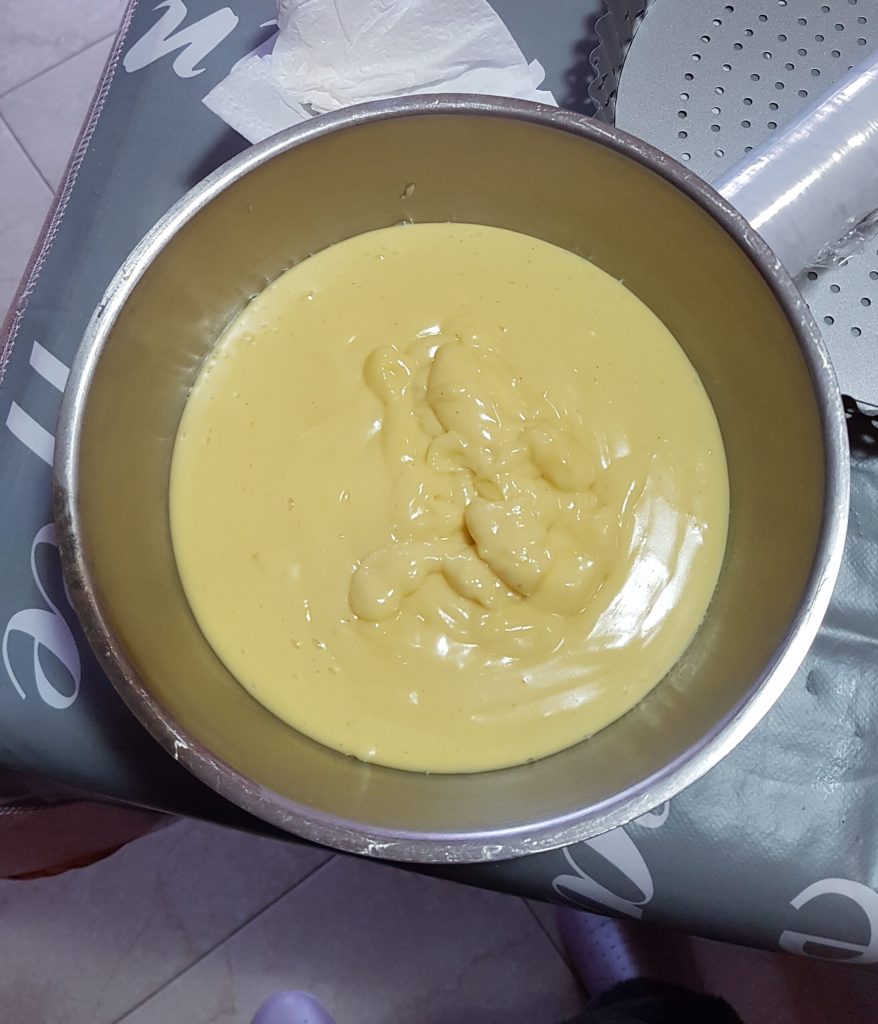 • Despeje o leite em uma panela e coloque no fogo para aquecer. Separadamente, em uma tigela, bata as gemas com o açúcar e a essência de baunilha usando um batedor. Em seguida, adicione a farinha peneirada e misture bem. Despeje a mistura de ovos no leite e leve à ebulição, mexendo continuamente com o batedor para evitar que se formem grumos e deixar engrossar completamente. Retire do fogo e coloque o papel filme em contato e deixe esfriar em temperatura ambiente por algumas horas.