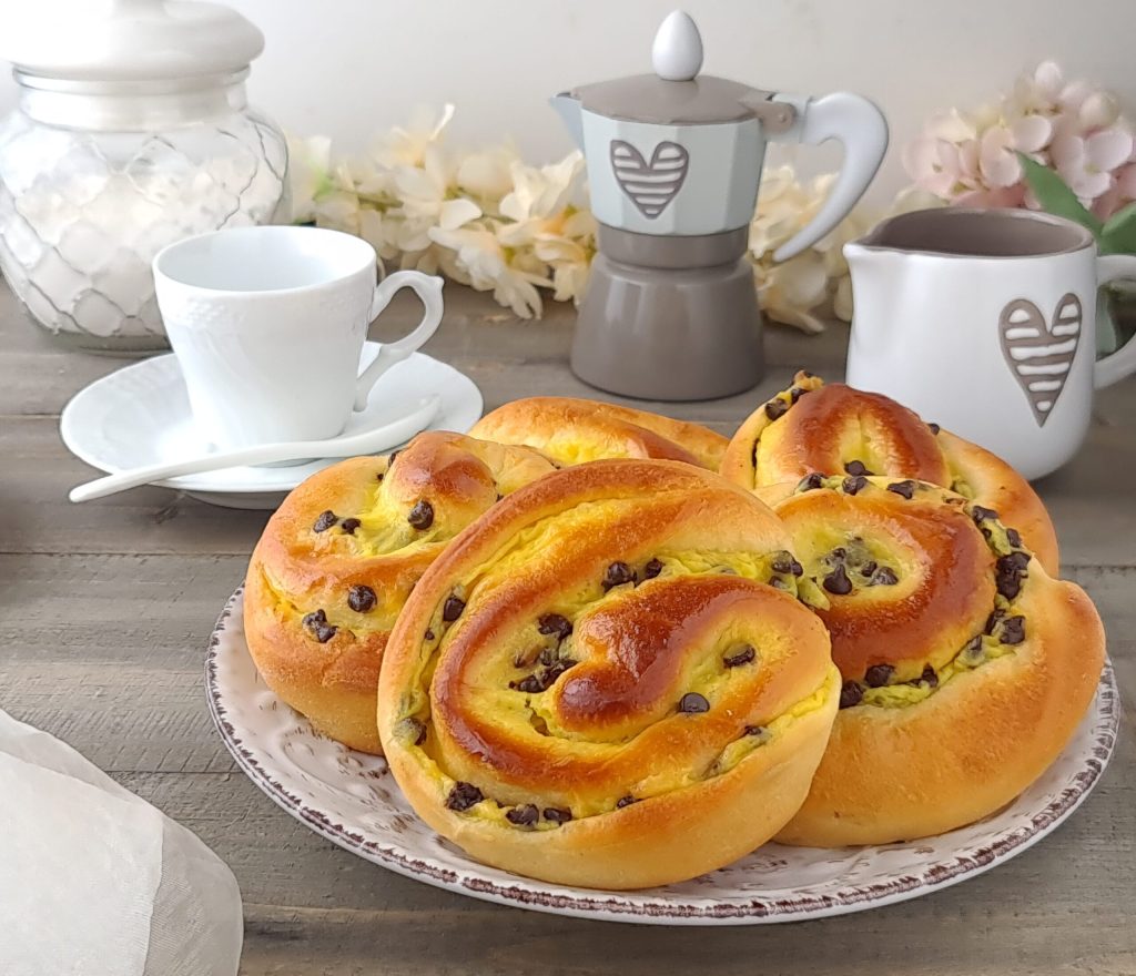 Enroladinhos de brioche com creme de confeiteiro e gotas de chocolate