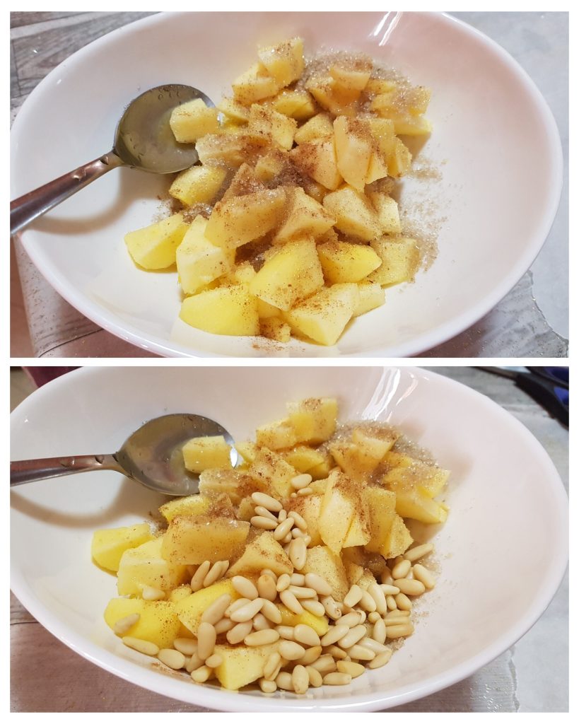 Para fazer este delicioso falso strudel de maçã com massa filo, descasque e corte as maçãs em cubos pequenos e coloque em uma tigela grande. Adicione o açúcar, o suco de limão, a canela, o rum e misture. Por fim, adicione os pinhões e reserve.