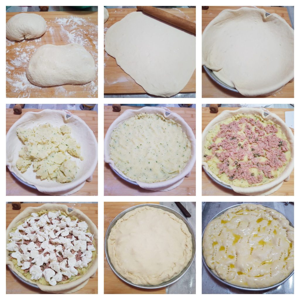 • Em uma superfície enfarinhada, divida a massa em duas partes e, usando o rolo de massa, abra a massa e coloque-a em uma forma redonda de 28 cm previamente untada. Recheie a base com a mistura de batatas, adicione o atum escorrido, as alcaparras e a mozzarella em cubos. Feche com o restante da massa, também aberta previamente com o rolo. Com as mãos, finalize as bordas selando bem. Coloque a forma para fermentar por cerca de 40 minutos. Após a última fermentação, pincele a superfície com azeite de oliva extra virgem, faça furos na superfície e asse em forno pré-aquecido a 180º-200º por 40-45 minutos ou até dourar.