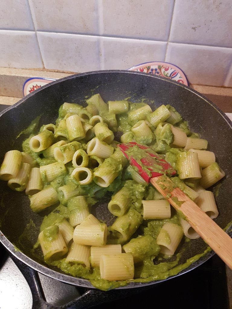 Cozinhe os mezzi rigatoni na água onde cozinhamos os brócolis anteriormente. Escorra a massa al dente e adicione-a na frigideira junto com o creme de brócolis e algumas conchas de água quente do cozimento e misture por alguns minutos.