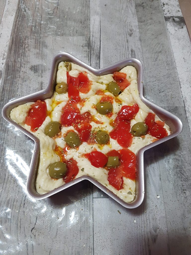 - q.b. azeite extravirgem de oliva para colocar sobre a focaccia antes de assar
