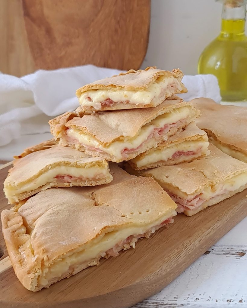 Retome a massa, divida-a em duas partes e abra a primeira parte em uma superfície enfarinhada com a ajuda de um rolo de massa. A massa tende a se retrair porque não tem fermento de padeiro, mas você conseguirá abri-la sem problemas. Unte bem uma assadeira ou forma de 26-28 cm com azeite e forre com o primeiro disco de massa. Recheie a base com fatias de presunto cozido e fatias de scamorza, e estenda a segunda massa e feche com o restante disco, selando bem as bordas para não deixar o recheio sair durante o cozimento. Pincele a superfície com azeite extra virgem de oliva e asse em forno pré-aquecido ventilado a 180°-190° por cerca de 30-35 minutos ou até dourar. Desligue, retire do forno e deixe esfriar.