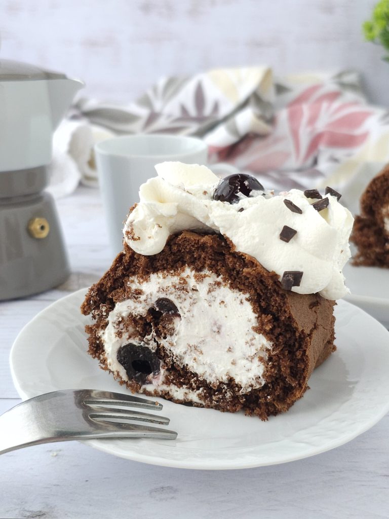 • Bata o creme de leite fresco bem gelado da geladeira com uma batedeira elétrica. Bata o creme bem firme adicionando o açúcar de confeiteiro com baunilha. Pegue o rolo, desenrole e, usando um pincel de cozinha, umedeça levemente a base do rolo com a calda de kirsch, recheie com o creme batido e coloque as cerejas em calda. Não use todo o creme batido para rechear, reserve algumas colheres para a decoração final. Enrole o rolo com delicadeza e coloque na geladeira para firmar por algumas horas.
