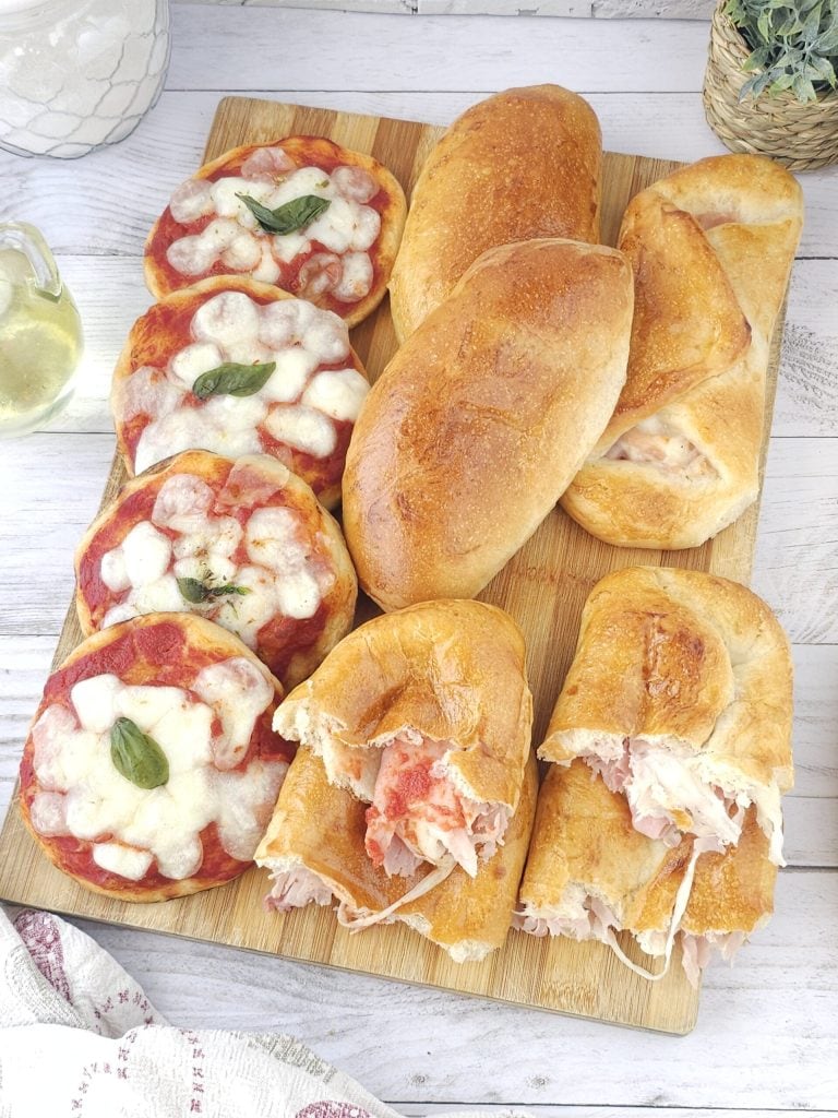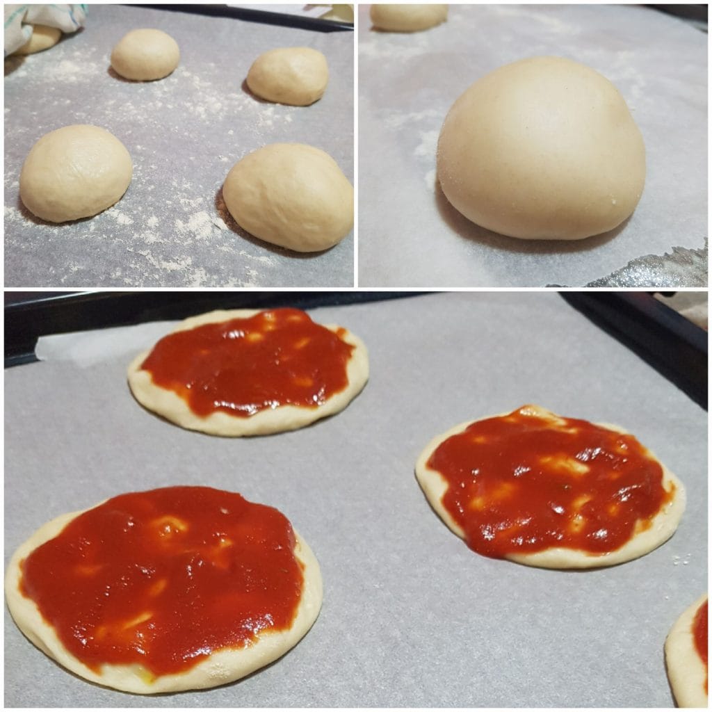 Quando a massa estiver crescida, forme bolinhas ou esferas de cerca de 60 g cada, coloque cada bolinha em uma assadeira forrada com papel manteiga e deixe crescer em temperatura ambiente por cerca de 1-2 horas. Após a fermentação, pressione levemente a superfície da minipizza e adicione ou espalhe uma colher de molho de tomate, orégano, uma pitada de sal e um fio generoso de azeite. Asse a 200ºC por cerca de 10-12 minutos, dependendo obviamente do forno de cada casa. Nos últimos 2 minutos, adicione os cubos de scamorza na superfície e as azeitonas, e volte ao forno.