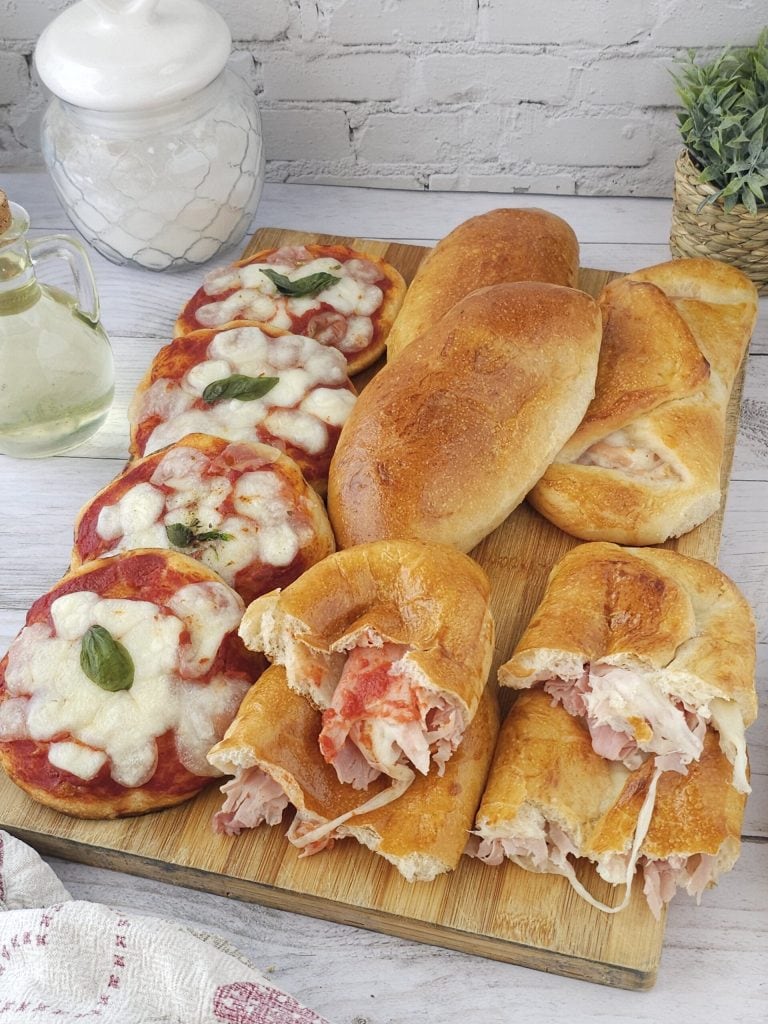 Quando a massa estiver crescida, forme esferas de 80 g cada e deixe crescer por uma hora. Depois de passado o tempo de fermentação, com a ajuda de um rolo de massa, achate cada bolinha formando um círculo, nem muito fino nem espesso, apenas o suficiente, e coloque no centro o presunto cozido e a scamorza. Feche unindo as duas extremidades da massa, deixando as duas pontas abertas.