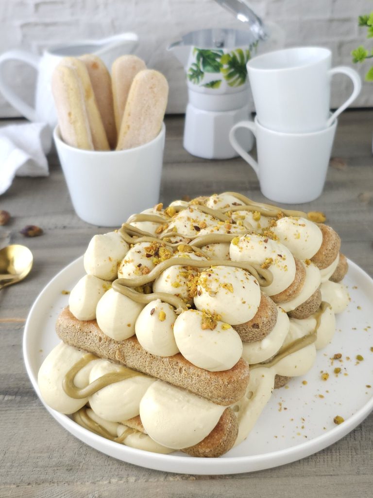 Começo dizendo que você pode fazer um tiramisù no prato ou o clássico e tradicional na travessa. Coloque e disponha 4 biscoitos champagne no prato e, com uma colher, regue com o café preparado anteriormente, depois faça pontas de creme de mascarpone colocado anteriormente em um saco de confeitar com bico liso, decore com um pouco de creme de pistache e continue assim com outros biscoitos embebidos no café, creme de pistache e, finalmente, decore a superfície com mais creme de pistache e granulado de pistache. Depois, leve à geladeira para firmar por cerca de 1 hora.