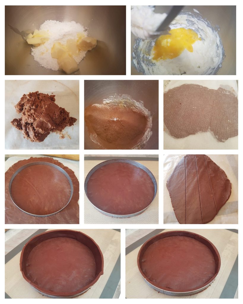 • Para fazer esta maravilhosa torta, é necessário primeiro preparar a massa de chocolate com antecedência. Primeiro, retire a manteiga da geladeira e deixe-a em temperatura ambiente para que fique macia, cerca de 15 graus. Na tigela da batedeira planetária, usando um gancho em formato de folha, trabalhe a manteiga com a essência de baunilha e o açúcar de confeiteiro até obter um creme homogêneo. Adicione o ovo previamente batido com um garfo e, por último, acrescente a farinha 00, o sal e o cacau em pó, continuando a misturar até obter uma massa homogênea. Quem não possui uma batedeira planetária pode fazer essa massa simples à mão em uma tigela. Coloque a massa obtida em uma folha de papel manteiga e, usando outra folha de papel manteiga e um rolo de massa, estenda até obter uma folha com 3 mm de espessura. Coloque na geladeira para firmar por 2 horas. Unte e enfarinhe uma forma de torta de 22 cm ou, se usar o famoso anel de torta perfurado, não será necessário untá-lo. Usei o último. Retire a massa da geladeira e recorte a base usando a circunferência do anel, deixando a massa dentro. Com a massa restante, recorte tiras para forrar as bordas do anel. Tenha cuidado, quando revestir o anel, a massa deve estar fria; se aquecer, basta colocar na geladeira por alguns minutos. Com os dedos, pressione bem as tiras de massa ao longo das bordas da base, cortando o excesso com uma faca. Quando estiver pronto, coloque no freezer para descansar por duas horas. Se usar uma forma de torta comum, basta forrá-la conforme a tradição. Asse em forno estático pré-aquecido a 170ºC por 25 minutos. Desligue, desenforme e deixe esfriar.