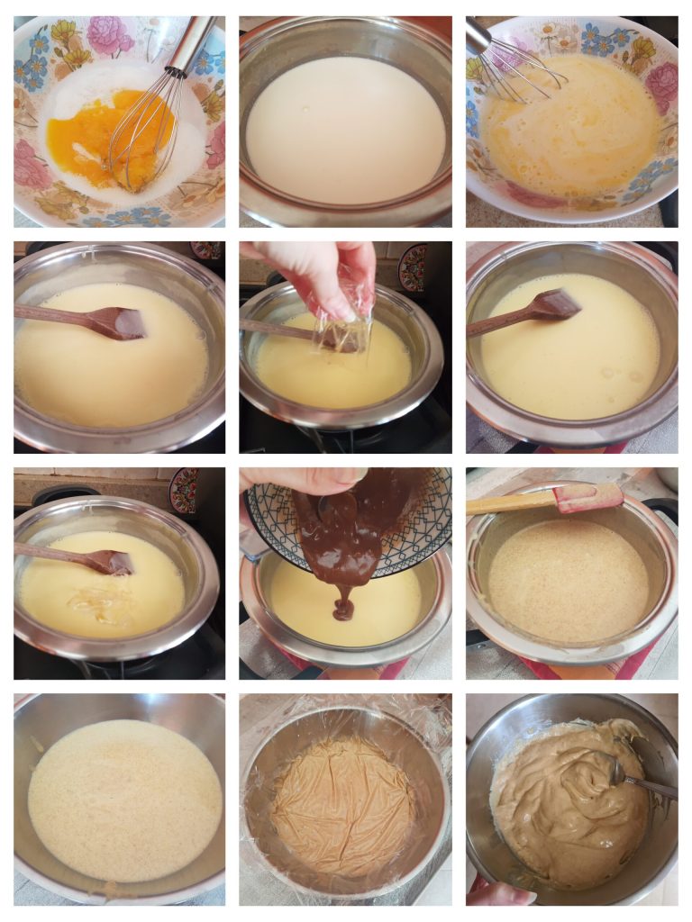 • Em uma tigelinha, coloque a gelatina para amolecer em água. Em uma panela pequena, coloque o creme de leite e o leite para ferver suavemente. Em uma tigela, bata as gemas com o açúcar usando um batedor manual, sem bater excessivamente. Pegue o creme de leite e derrame sobre a mistura de ovos, mexendo. Depois, despeje tudo na panela e continue cozinhando, mexendo com uma colher até atingir e não ultrapassar 84º, se não tiver termômetro, saberá que o creme inglês está pronto quando a colher ficar velada. Esprema a gelatina e adicione ao creme inglês. Por fim, adicione a pasta de avelã à mistura e misture bem. Coe com a ajuda de um coador, coloque filme plástico em contato e deixe esfriar por 45 minutos à temperatura ambiente, mexendo de vez em quando.