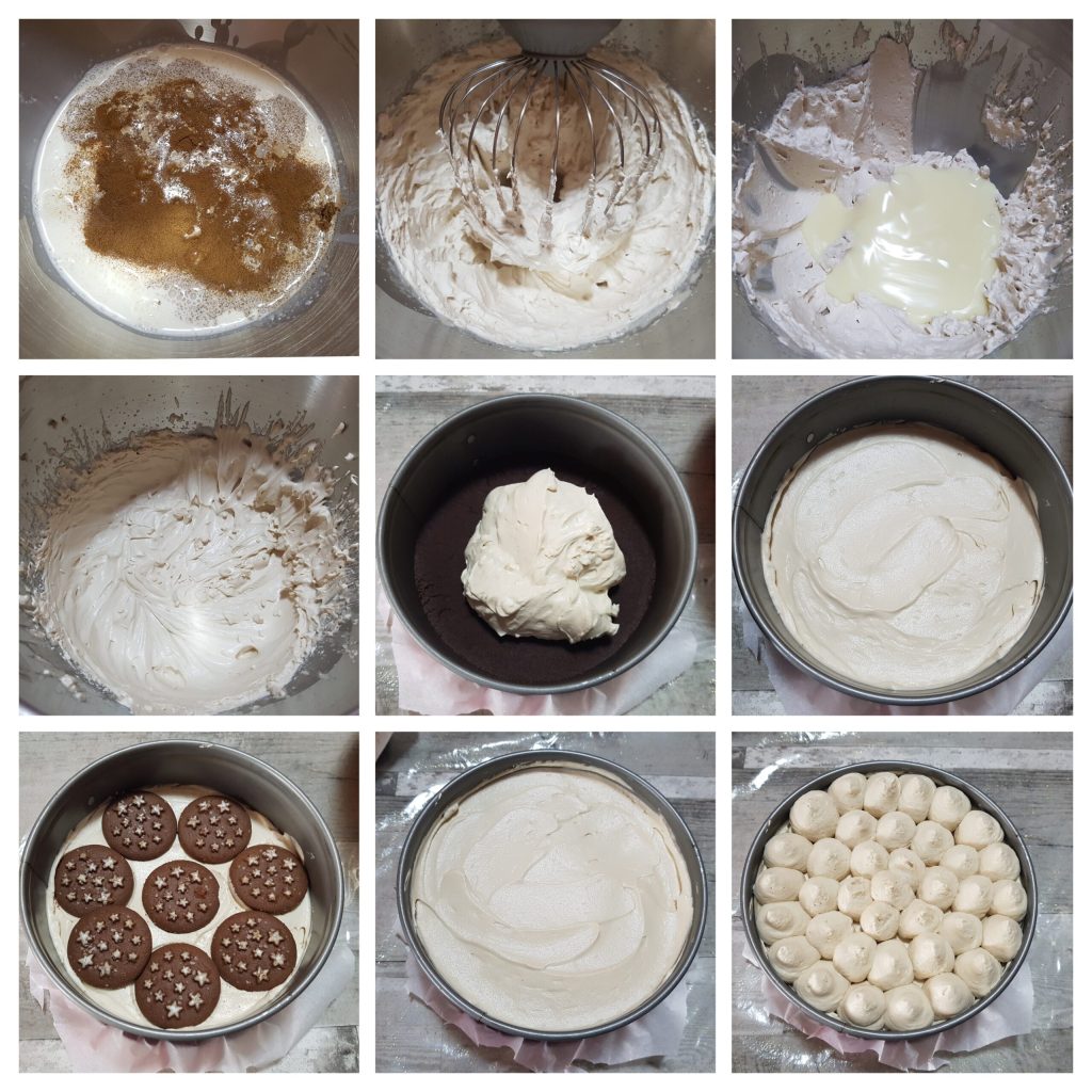 Em uma tigela, bata com uma batedeira elétrica o creme de leite fresco bem frio da geladeira e o café solúvel. Quando o creme de leite estiver bem firme e batido, adicione o leite condensado frio da geladeira aos poucos e continue batendo com a batedeira até obter uma mistura espumosa. Se formos usar o café expresso, basta prepará-lo com antecedência, deixá-lo esfriar e adicioná-lo somente depois que o creme de leite e o leite condensado estiverem batidos juntos. Retire do freezer a forma e despeje metade do creme de café, coloque uma camada de biscoitos pan di stelle e despeje o restante do creme, deixando algumas colheradas para os picos. Coloque o restante do creme em um saco de confeitar com bico liso e faça os picos. Coloque no freezer para firmar por 4-5 horas.