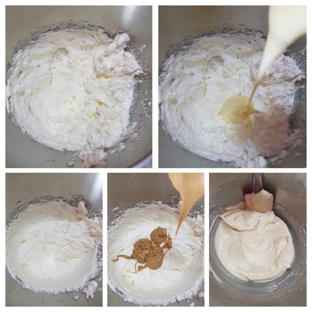 Em uma tigela, bata bem com batedores elétricos o creme de leite fresco bem gelado. Adicione o leite condensado frio de geladeira, o licor e continue batendo com os batedores até obter uma mistura cremosa e espumosa. Por fim, adicione o creme branco de avelã e misture bem.