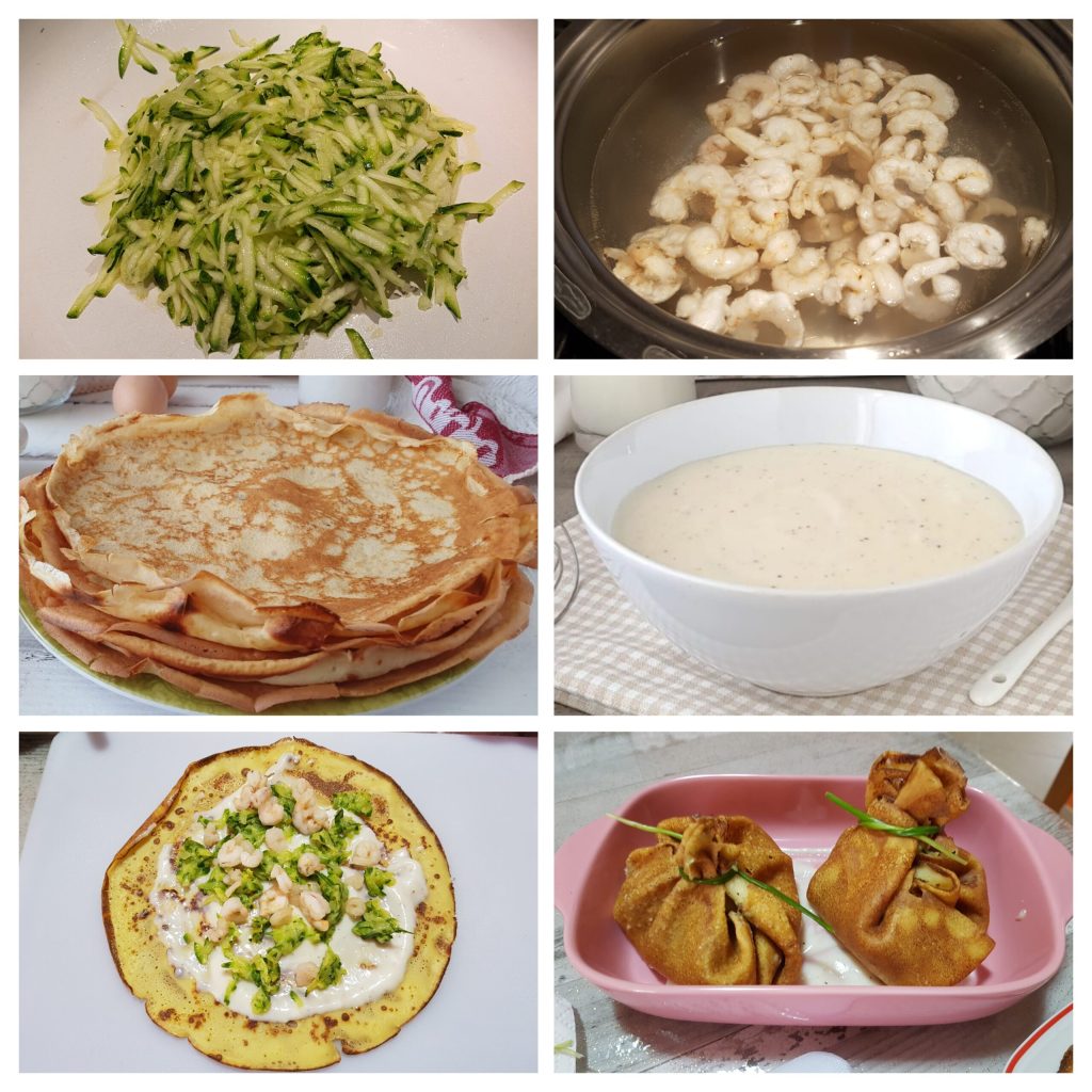 Passos para as trouxinhas de crepes com abobrinha e camarões