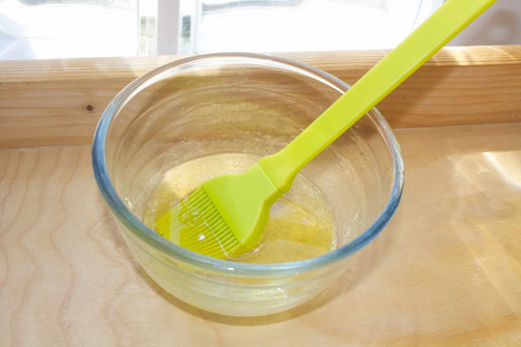 Enquanto isso, em uma tigelinha, preparamos uma mistura com duas colheres de sopa de óleo, meio copo de água e uma colher de sopa de sal fino.