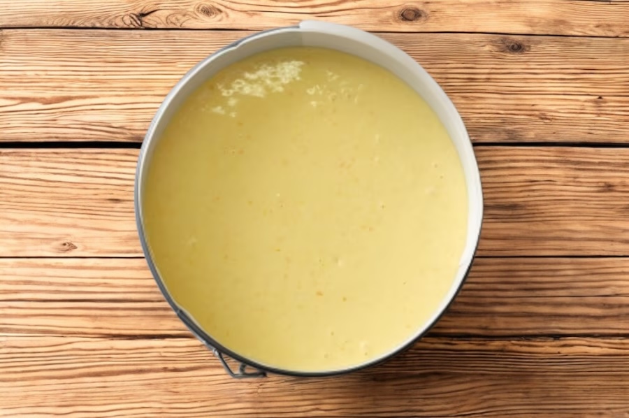 Adicione o fermento e o sal, e bata novamente até alcançar uma consistência cremosa. Despeje a mistura em uma forma de aro removível de 24 cm de diâmetro, previamente untada e enfarinhada.