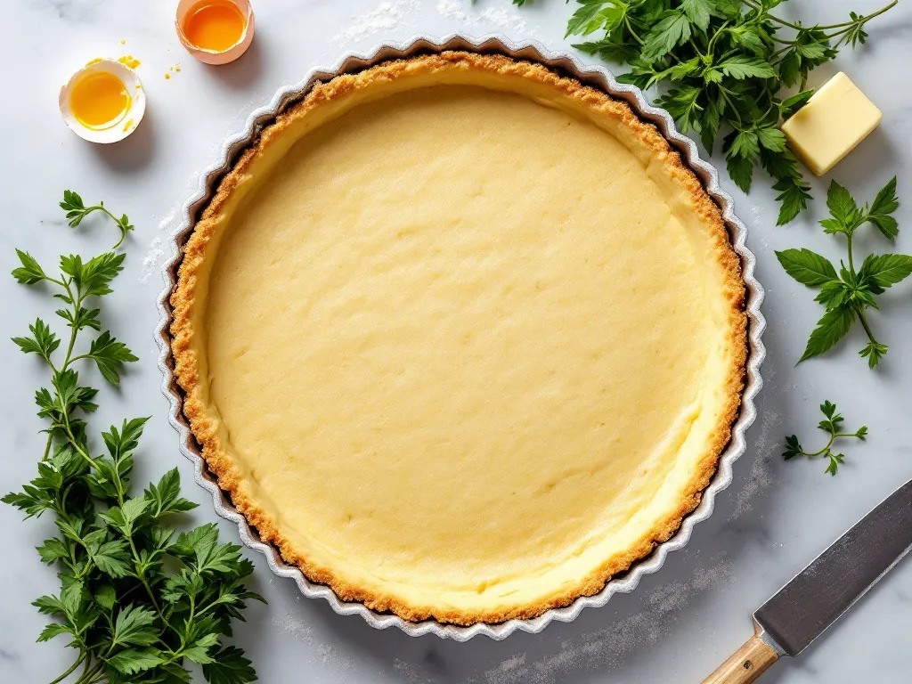 Estenda a massa, forre uma forma untada, fure o fundo e asse em forno estático a 180°C: primeiro 20 minutos com leguminosas secas por cima, depois 10 minutos sem.
