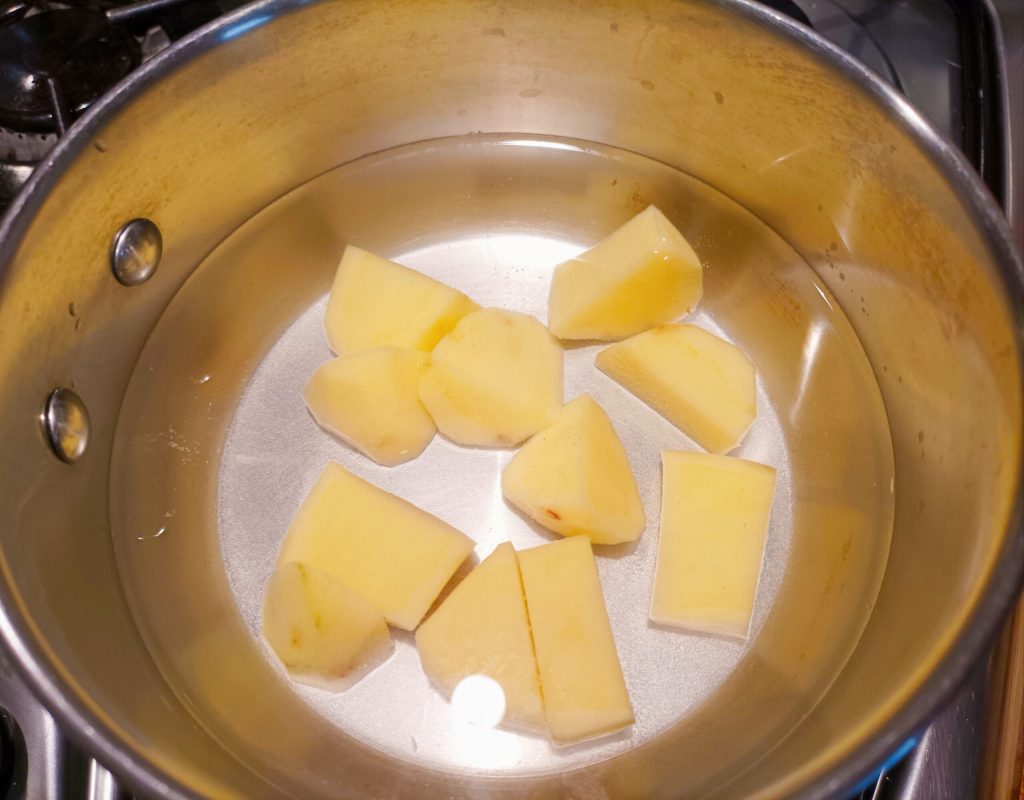 • Primeiro lave a batata, corte-a em cubos e cozinhe, adicionando um pouco de sal na água.