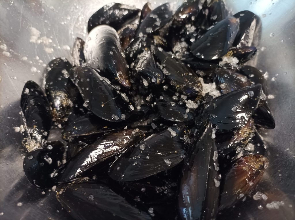 Primeiro, você deve limpar os mexilhões removendo-os do biso, e para limpar a parte das conchas, um método muito simples é colocar os mexilhões em um saco plástico com sal grosso e esfregá-los por alguns minutos. Os mexilhões ficarão limpos para serem usados com as conchas.