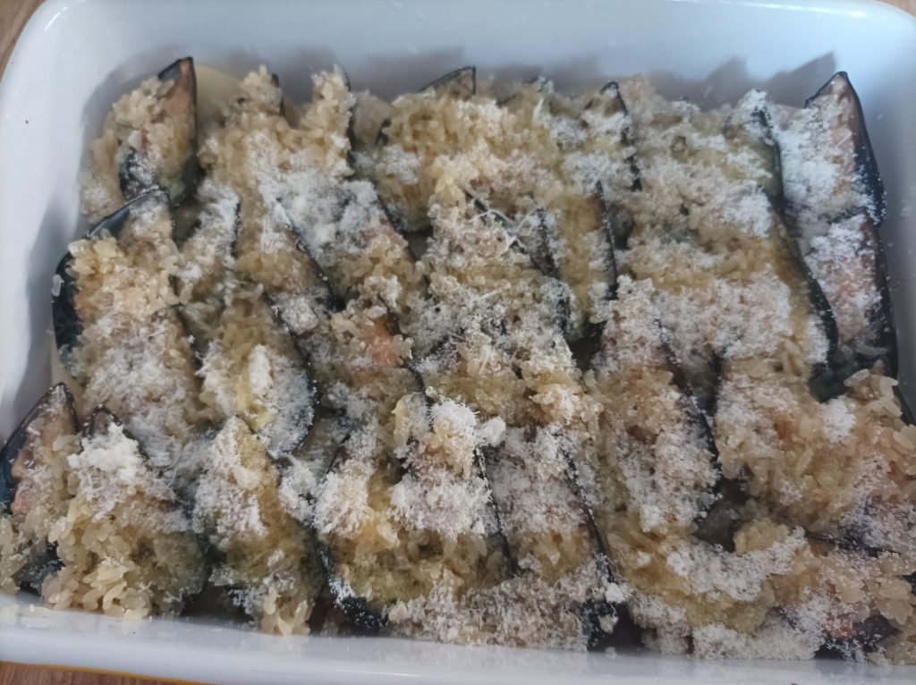 Agora adicione o arroz que você colocou na água como se estivesse colocando queijo, deve cobrir todos os mexilhões.