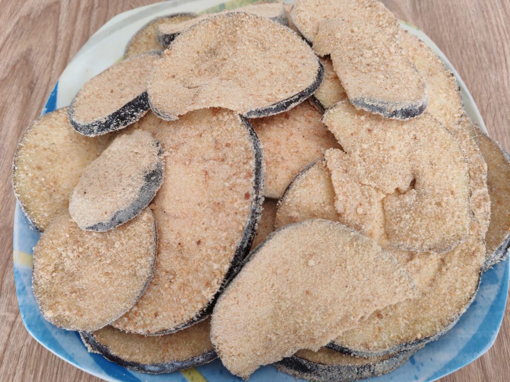 Empane as fatias de berinjela fazendo um pouco de pressão para que a farinha de rosca adira bem.
