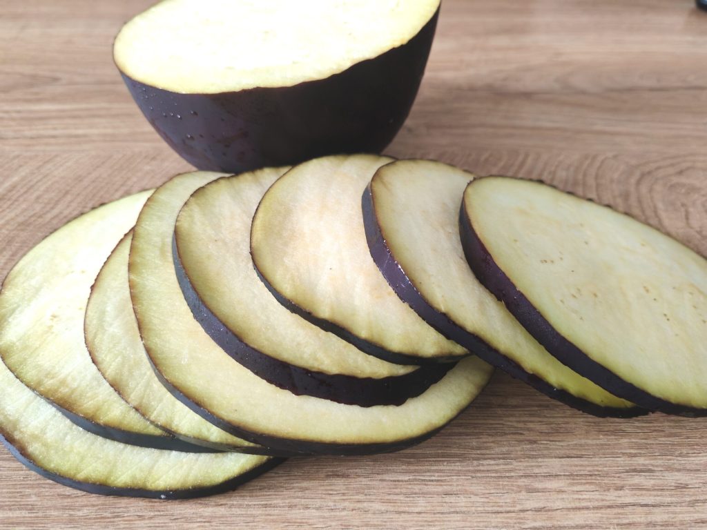 Lave as berinjelas, corte as pontas e fatie-as com uma espessura de cerca de 5 mm.