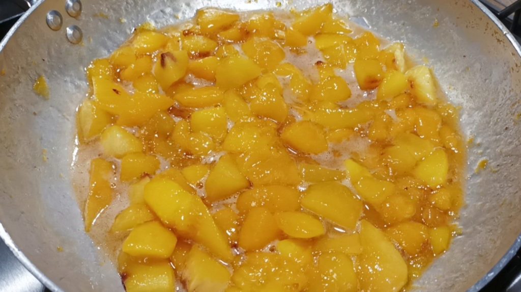 Agora, prepare o purê de pêssegos. Lave e descasque os pêssegos, corte-os em cubos e adicione o limão, coloque na frigideira e adicione o açúcar. Ligue em fogo baixo e deixe amolecer. Vai levar cerca de 10 minutos, mas ajuste-se, assim que estiverem macios, desligue.