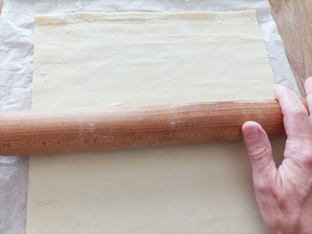 Agora prepare a massa folhada. Desenrole a massa folhada deixando-a sobre o seu papel manteiga, com o rolo de massa, achate-a um pouco, depois com os dentes do garfo fure toda a superfície, polvilhe com açúcar de confeiteiro, coloque na assadeira e asse em forno pré-aquecido ventilado a 160°C por cerca de 15 minutos ou até ficar dourada. Proceda imediatamente da mesma forma com a outra massa folhada.