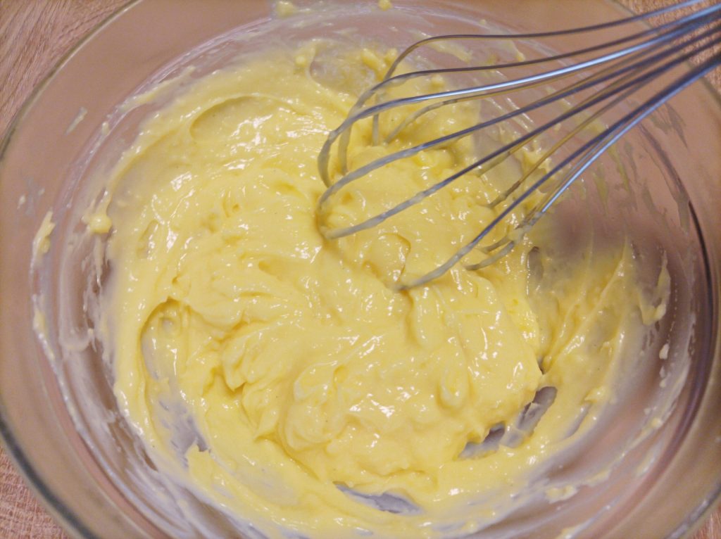 Quando a mistura estiver pronta, adicione a farinha peneirada em duas vezes, mexendo com uma espátula de baixo para cima.
