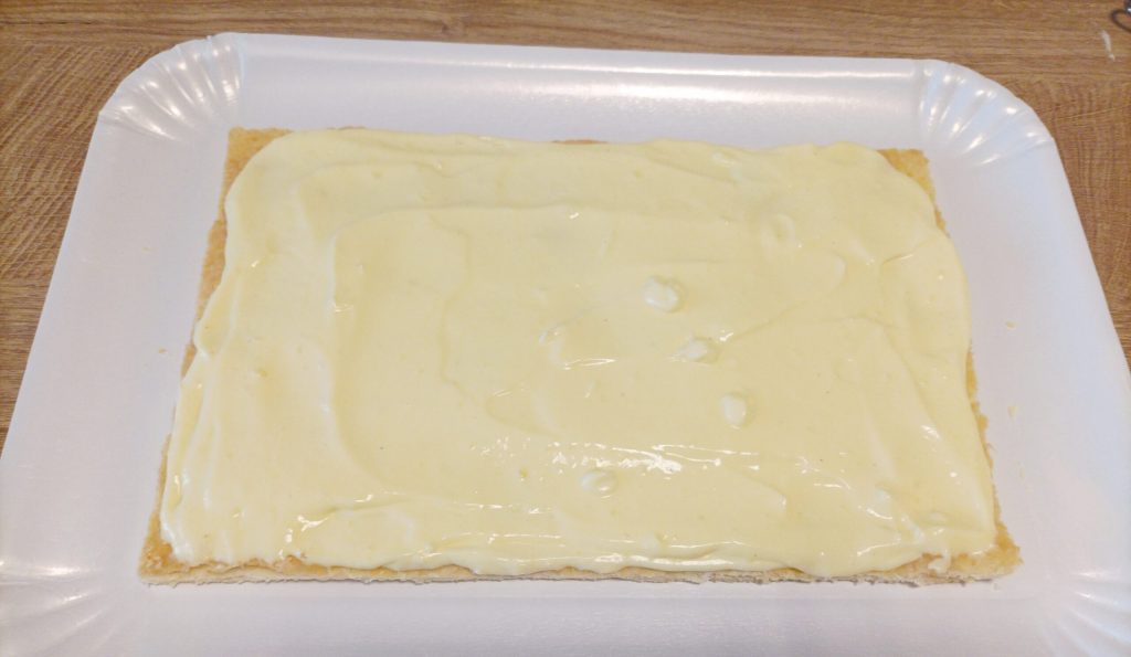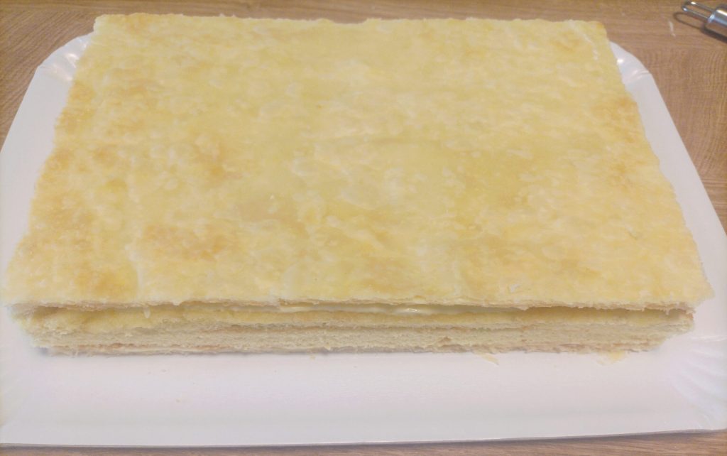 Em uma bandeja de servir, coloque a primeira massa folhada e recheie com metade do creme, depois coloque o pão de ló em cima e molhe com toda a quantidade de calda que você preparou, ao final coloque a outra parte do creme.