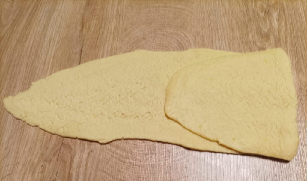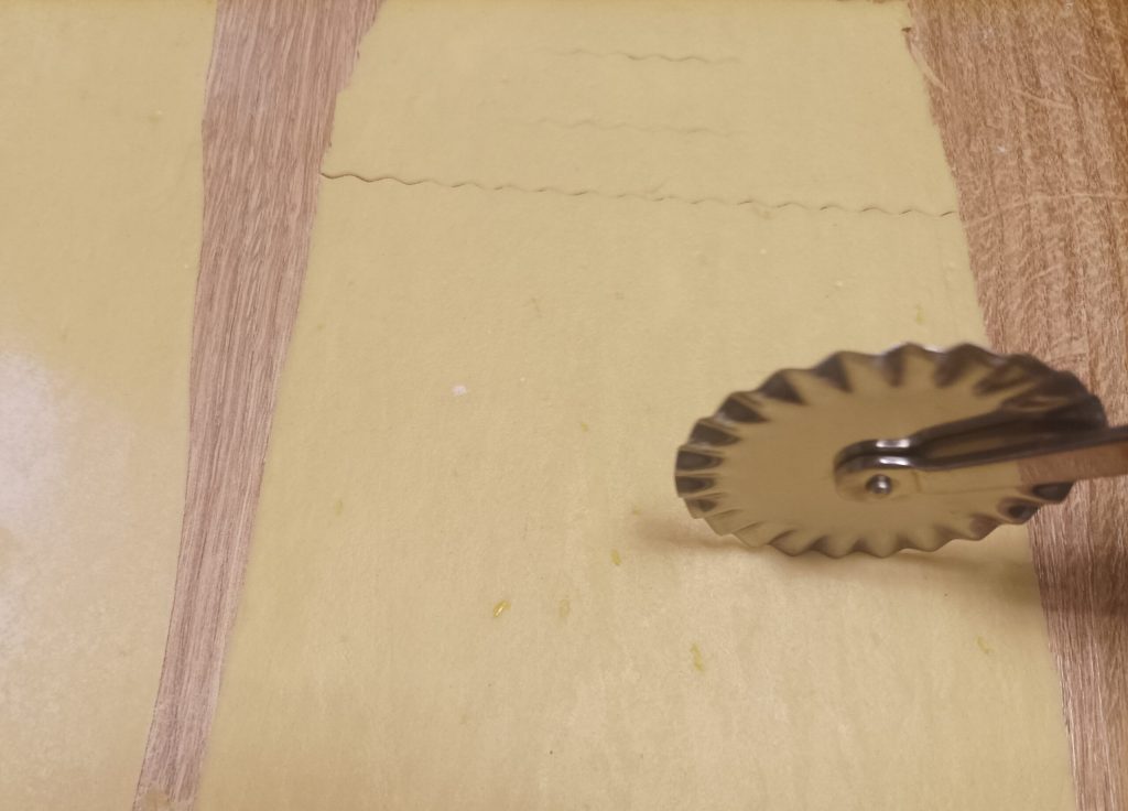 Quando terminar de estender todas as folhas, com um cortador de massa corte na horizontal da folha retângulos de cerca de 5 cm (você decide), fazendo 2 cortes no centro.