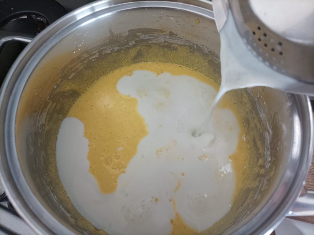 Em outra panela, aqueça o leite, o creme de leite e as raspas de limão, quando estiver prestes a ferver, desligue e despeje nas gemas, coado das raspas de limão.