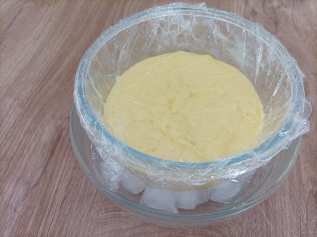 Depois, despeje em um recipiente e cubra com filme plástico em contato com o creme