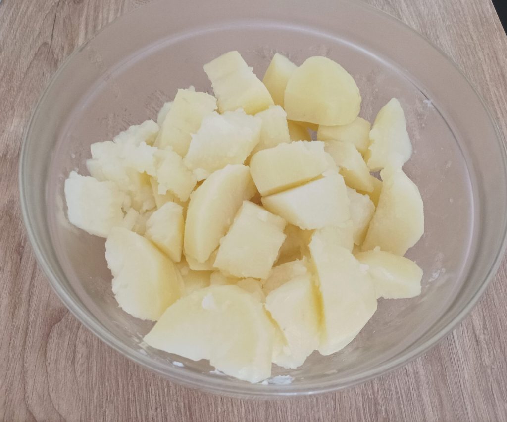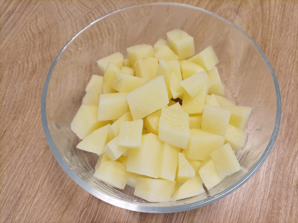 Primeiro, descasque as batatas e corte-as em cubos. Em uma panela coloque água com sal e cozinhe as batatas. Vai levar cerca de 20 minutos, mas você pode verificar o cozimento inserindo os dentes de um garfo; se entrarem facilmente, você pode desligar.