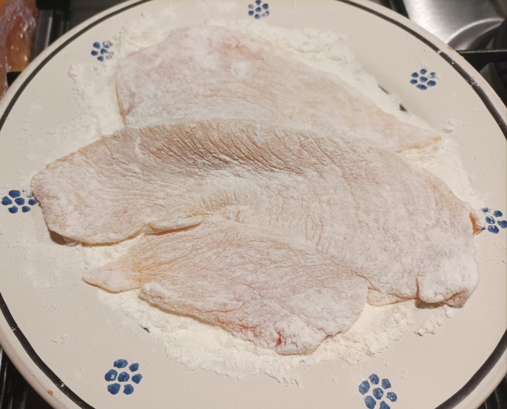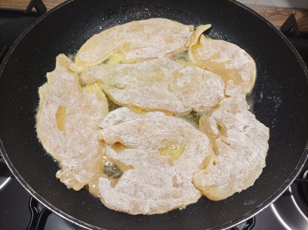 Para preparar as escalopes, serão necessárias fatias de peito de frango cortadas finas. Em um prato, prepare farinha e empane bem o peito de frango.