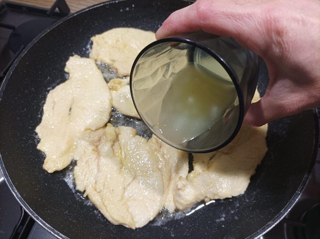 Quando estiver derretida e começar a fritar, adicione as fatias de frango.